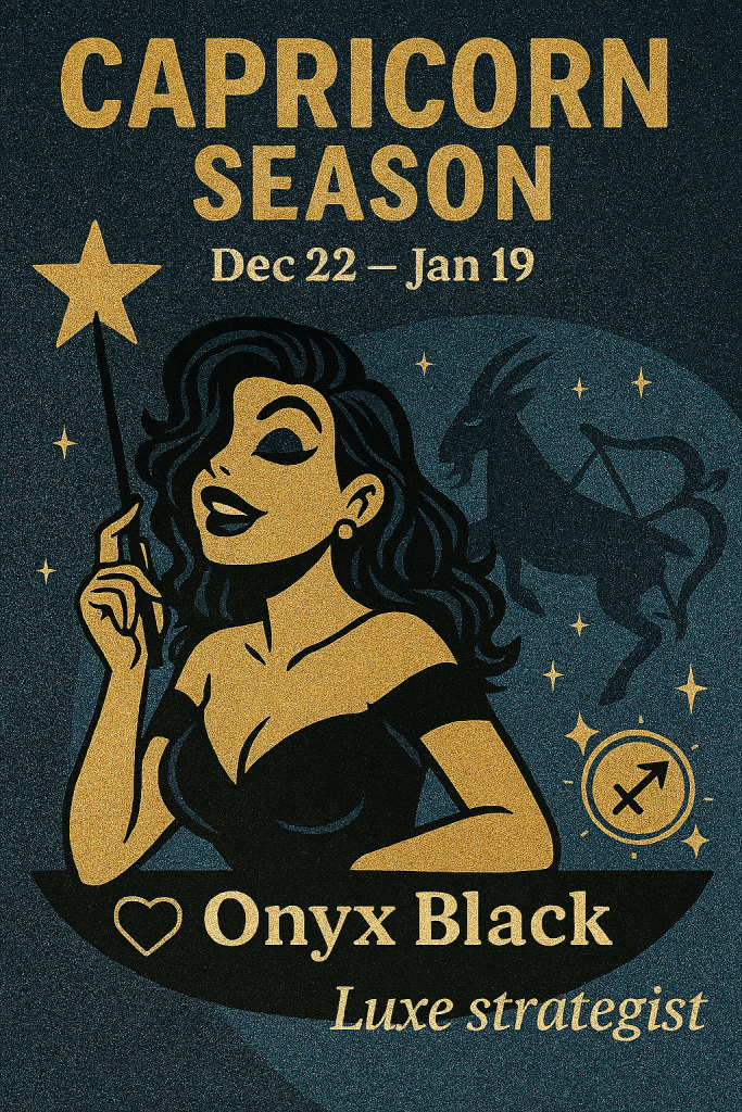 Capricorn season has arrived, and this is where the glitter settles, and the goals get real. It’s from December 22nd to January 19th. After a wild ride last month, Capricorn slips in wearing structured silhouettes, a smokey eye, and a five year plan in hand. Capricorn isn’t here to play, she’s here to build and conquer the world like the baddie that she is. We’re trading that cherry red for onyx black. Capricorn doesn’t just climb the mountain, she designs the stilettos to do it in style.