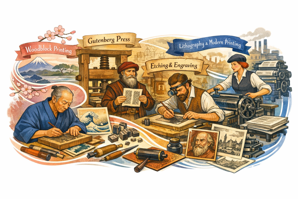 Printmaking has roots that stretch back over a thousand years. Woodblock printing, for instance, first appeared in China in the 7th century, used to reproduce Buddhists texts and images. It was slow, meticulous, and revolutionary. Suddenly knowledge didn’t have to be rewritten by hand. By the 14th and 15th centuries, woodcuts spread across Europe, becoming the go to method for illustrating books, religious imagery, playing cards, and even early news sheets.
