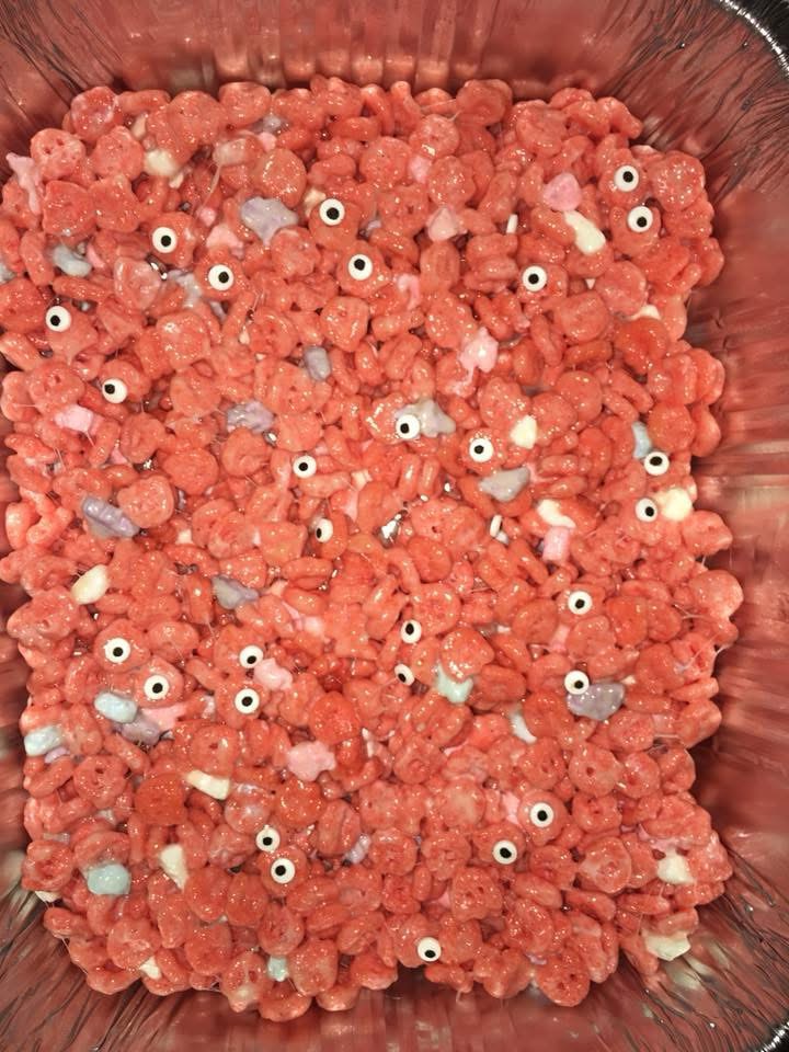 All are easy to make. The “Rice Crispy” treats were simply made the way you would make them i just used Frankenberry Cereal for the pink one and added spooky eyes and Reese’s Puffs with orange Melts and drizzled across them. For the bark, i make it for every holiday and it’s so simple, use your favorite chocolate chips or melts or bark chocolate. Add a bit of Crisco for an even smooth melt. I place it on parchment paper on a cookie sheet and pop it in the oven at 300 degrees for a few minutes until it looks melted. Using a rubber spatula I just smooth it while still on the parchment paper and pan. Add whatever Halloween candy you want to make it festive. Can use Halloween colored melts to add a drizzle. Let it harden and then break it up.