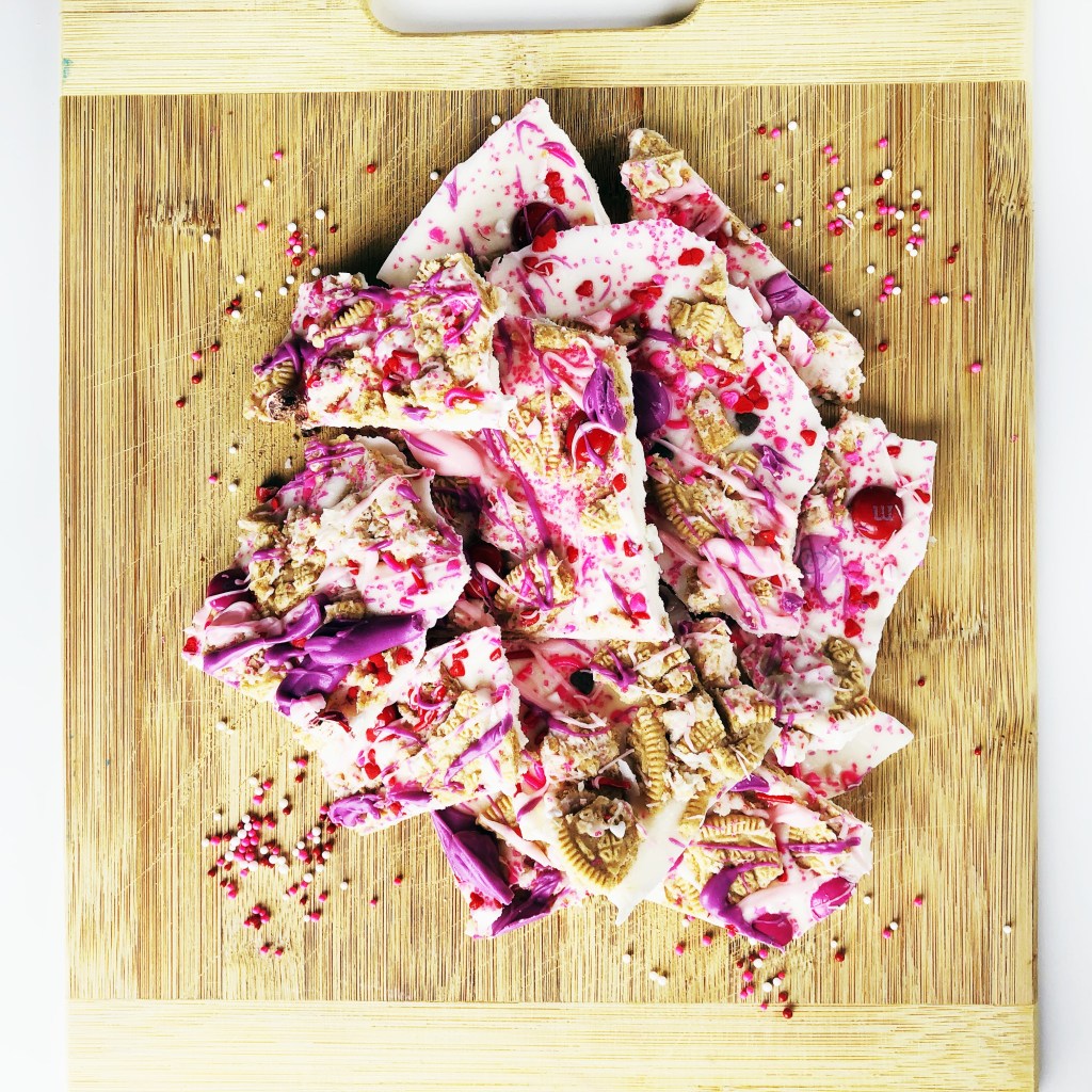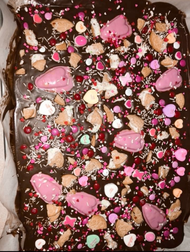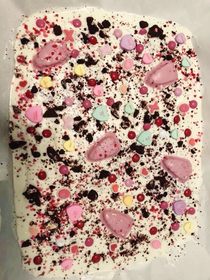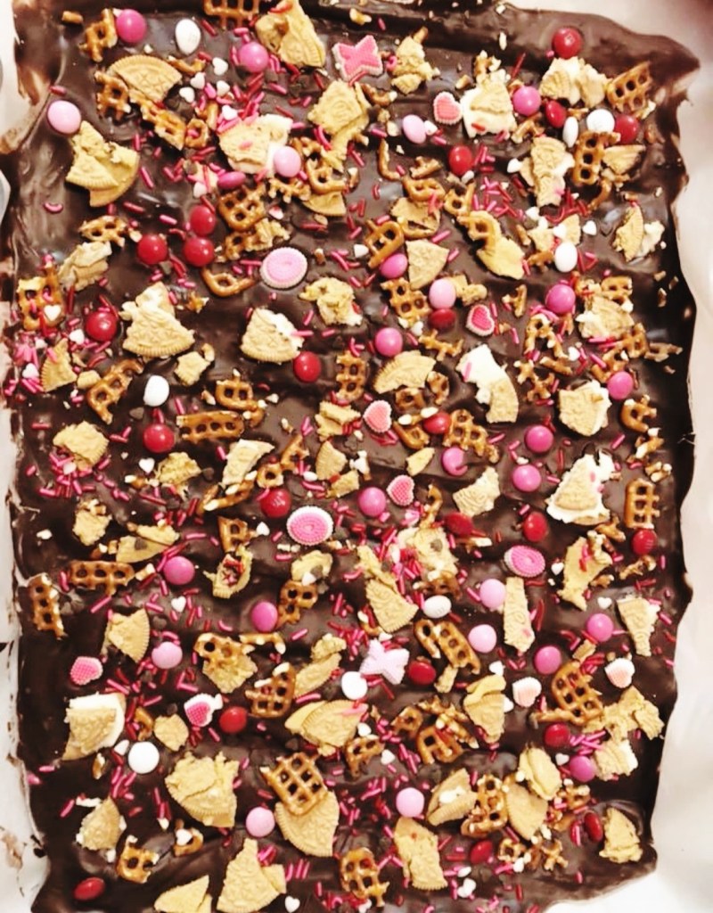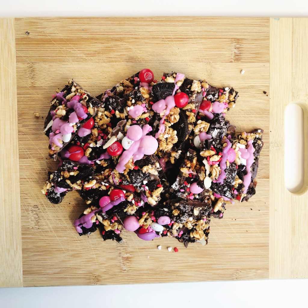 Regular chocolate of your choice. 20 oz Double Stuff Oreos. Half the regular size package. Crushed. Valentines Sprinkles of your choice. Use to your hearts content. Honey granola of your choice. 1/4 cup for light sprinkle Bright pink or purple vanilla candy wafers. 4-6 oz Valentine M&Ms 1/3 to 1/2 cup.