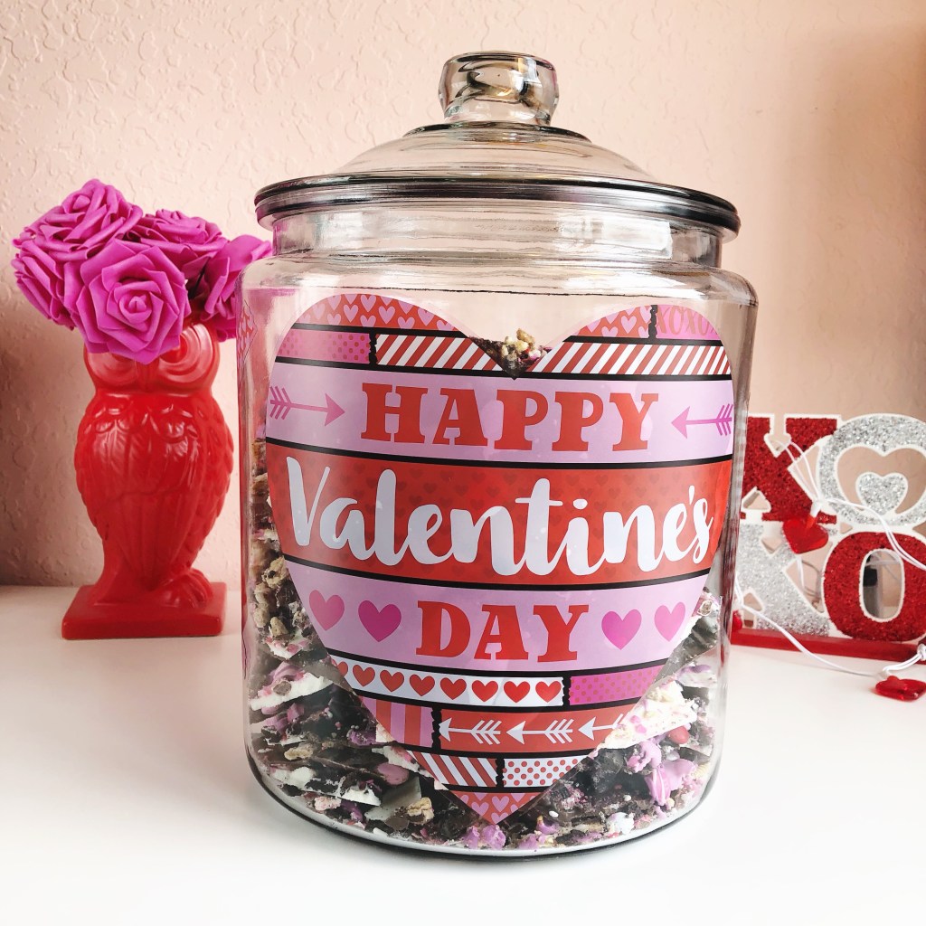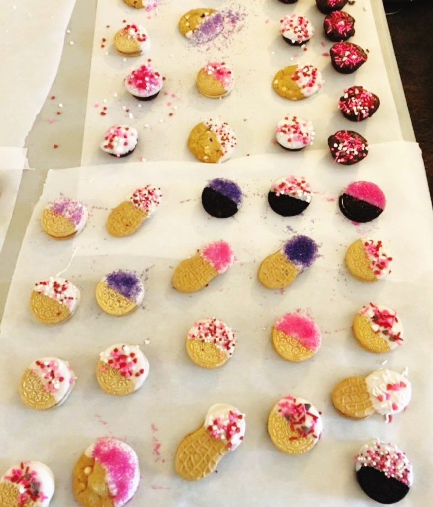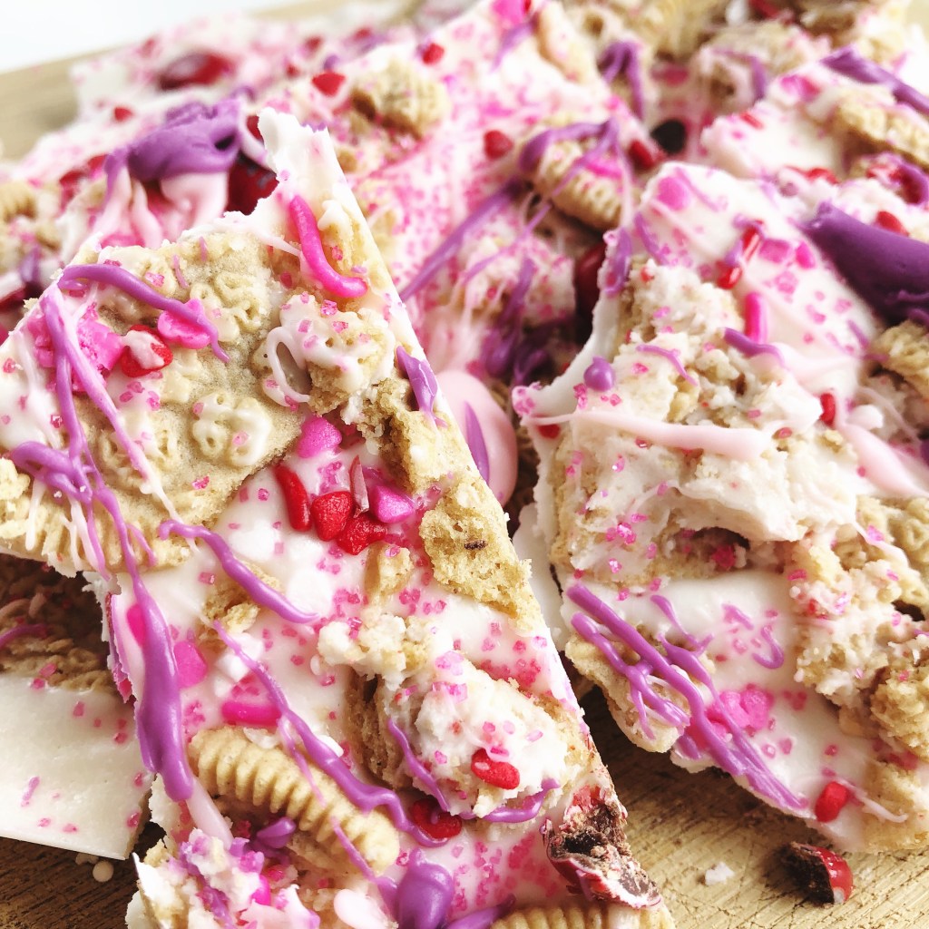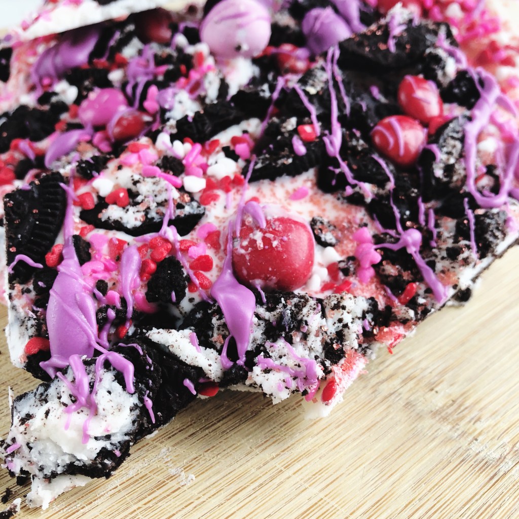 Regular chocolate of your choice. 20 oz Double Stuff Oreos. Half the regular size package. Crushed. Valentines Sprinkles of your choice. Use to your hearts content. Honey granola of your choice. 1/4 cup for light sprinkle Bright pink or purple vanilla candy wafers. 4-6 oz Valentine M&Ms 1/3 to 1/2 cup.