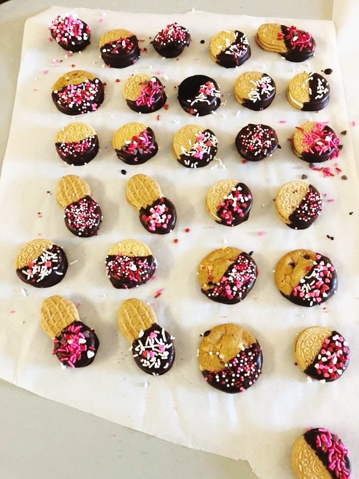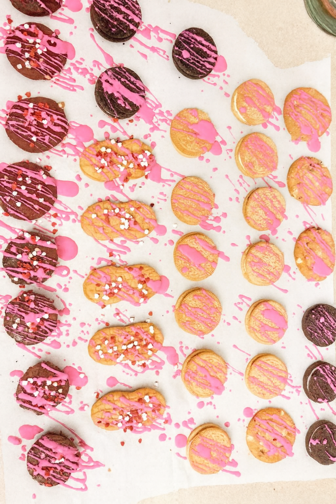 Regular chocolate of your choice. 20 oz Double Stuff Golden Oreos. Half the regular size package. Crushed. Valentines Sprinkles of your choice. Use to your hearts content. Valentine M&Ms 1/3 to 1/2 cup Reese pink chocolate hearts. About 6-8 Valentines sugar candy.