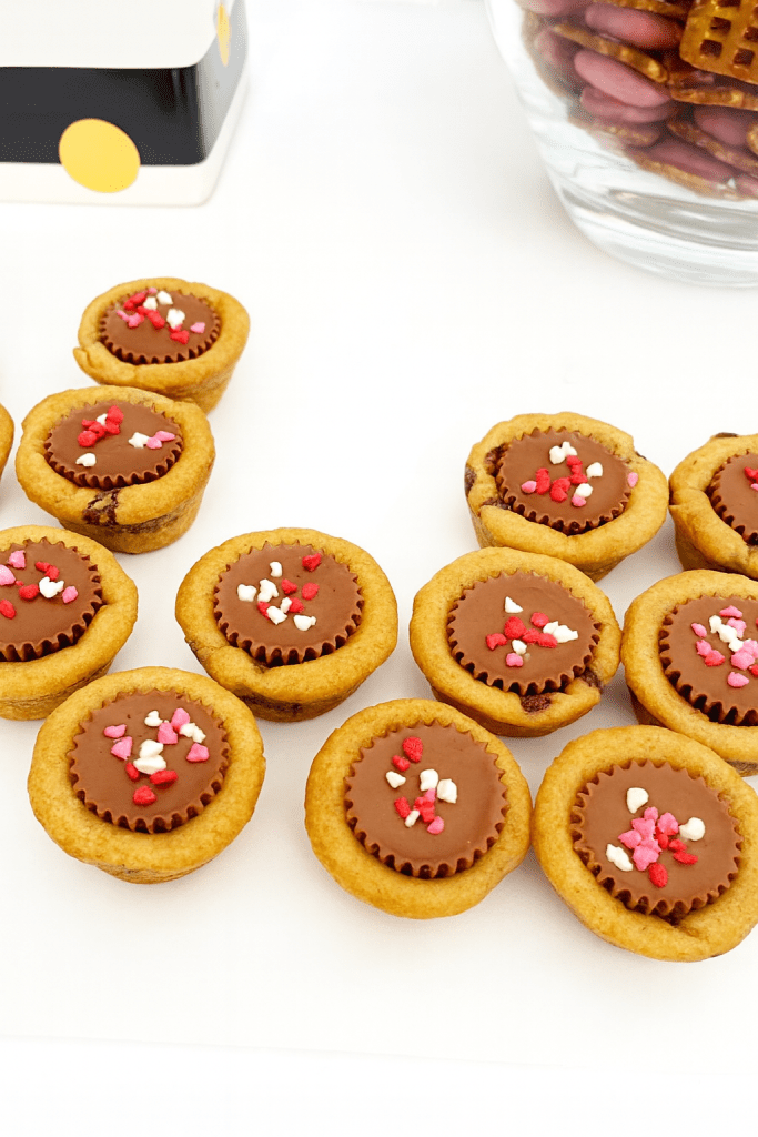 Press cookie dough into mini cups . Bake for the time it says. Depending on your oven it could take slightly less time. While baking unwrap Reese Cups. When cookies look golden take them out and immediately start pressing Reese cups into the center. They will melt slightly but as the cookie cools the Reeses will too. Sprinkle the Valentines sprinkle on top after all cookies have Reese cups. Let’s cool and then eat them. You can still eat them hot of course. Side note…. I make my cookie dough and use the Martha Stuart recipe called Ultimate Chocolate Chip Cookies and I swear by it. They are soft, chewy, and ohhhh so chocolatey.